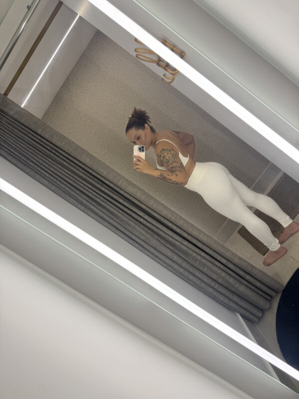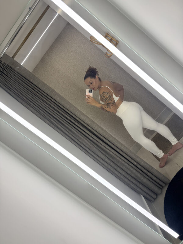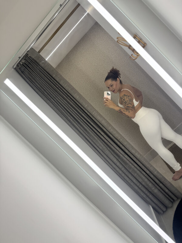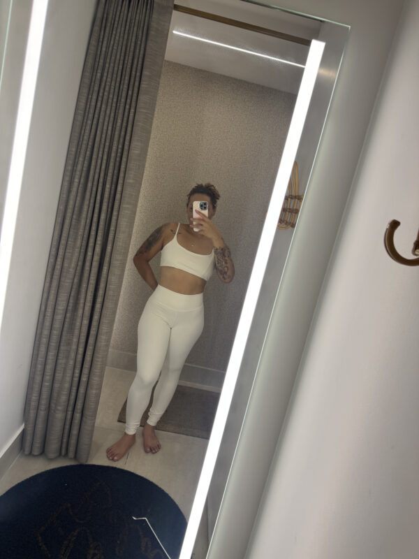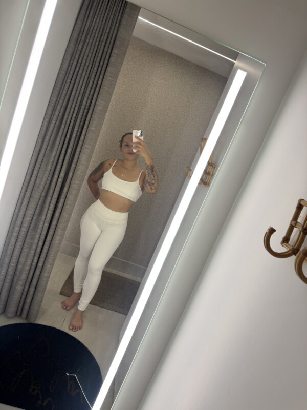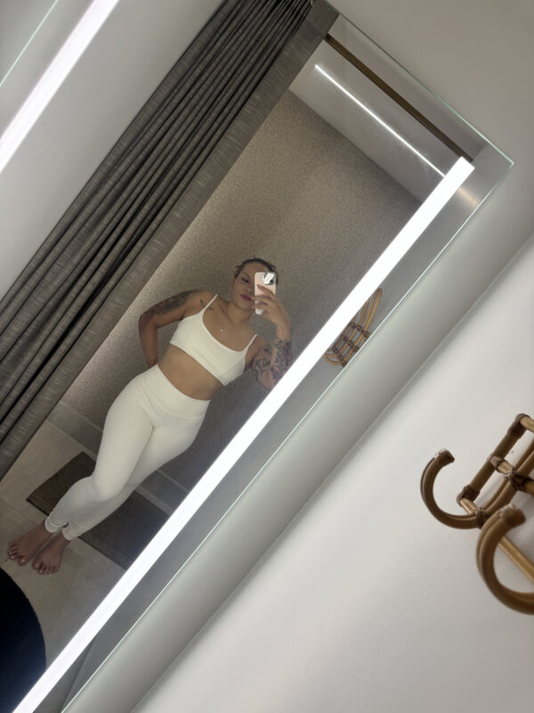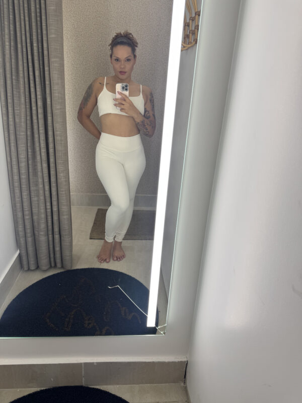 Conjunto branco com top delicado e legging cintura alta – leveza e estilo em um só look.